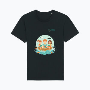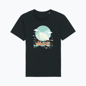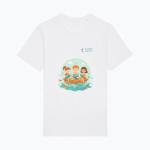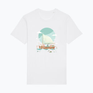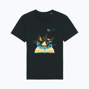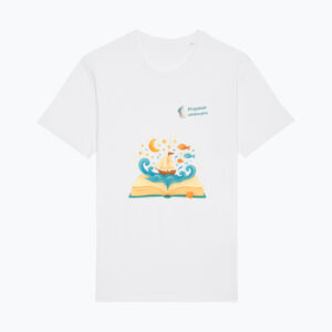 Grafika przedstawia otwartą książkę, z której wyrasta ocean pełen ryb, gwiazd i żaglowców — symbol podróży, która zaczyna się w wyobraźni, a kończy… wszędzie, gdzie tylko sięgają marzenia. To zaproszenie do świata, w którym nauka i zabawa płyną jednym kursem.