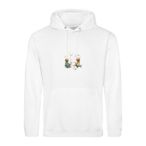 Okrągły nadruk z napisem dookoła dwóch rysujących dzieci tworzy symbol wspólnoty, współpracy i radości z bycia w grupie. To idealna bluza dla dzieci, które lubią dzielić się pomysłami, wspierać innych i marzyć w duecie lub w większej paczce.