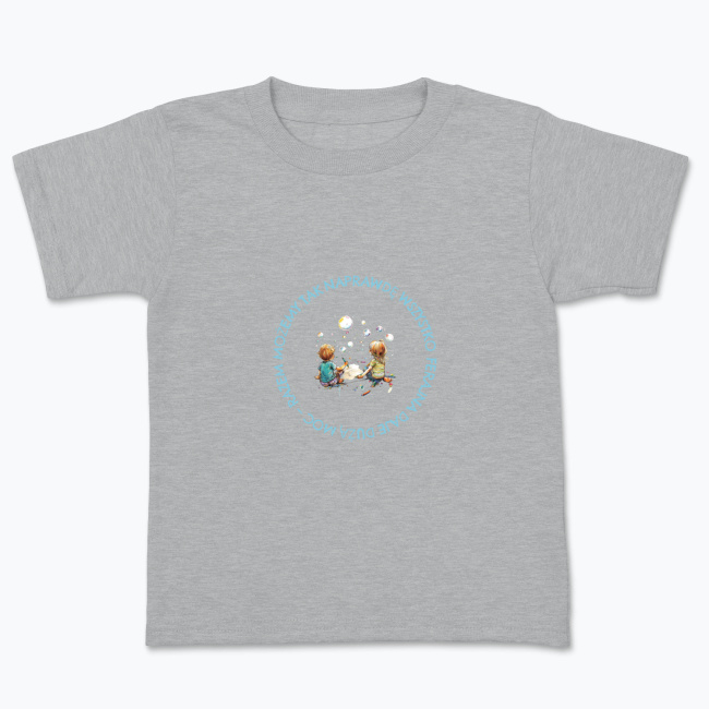 Ilustracja dzieci rysujących wspólnie świat, otoczona pozytywnym hasłem ułożonym w koło, działa jak tarcza dobra, którą każde dziecko może nosić z dumą. To ubranie nie tylko piękne wizualnie – to także głos dziecięcej siły, przyjaźni i wyobraźni.