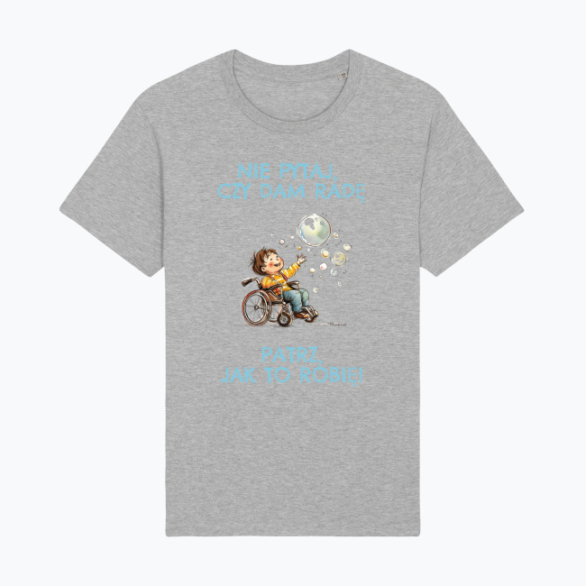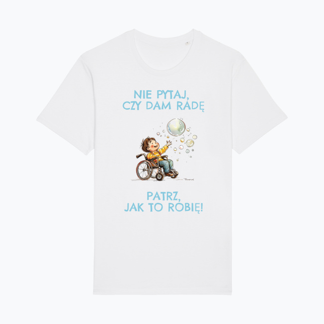 „Nie pytaj, czy dam radę. Patrz, jak to robię!” – ten nadruk to nie tylko hasło, to deklaracja postawy. Koszulka „Nie Pytaj, Patrz!” to mocny, inspirujący głos w imieniu tych, którzy codziennie pokonują bariery – nie dla uznania, lecz dlatego, że chcą żyć pełnią życia.