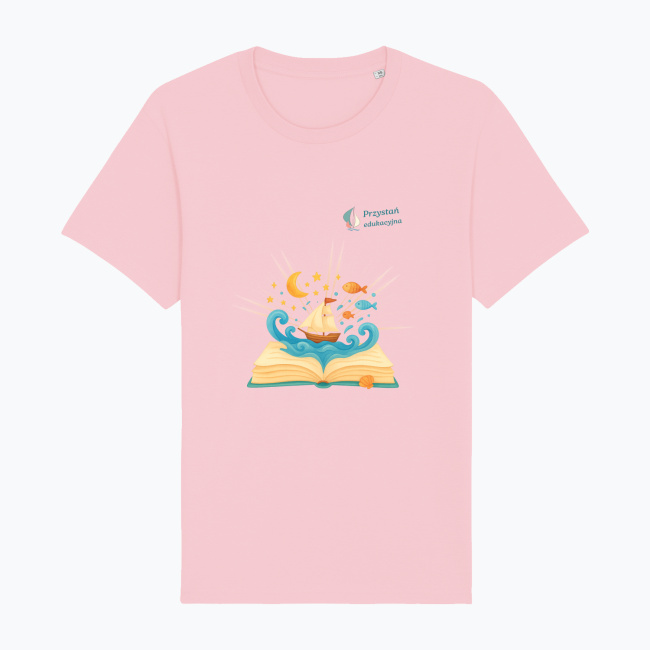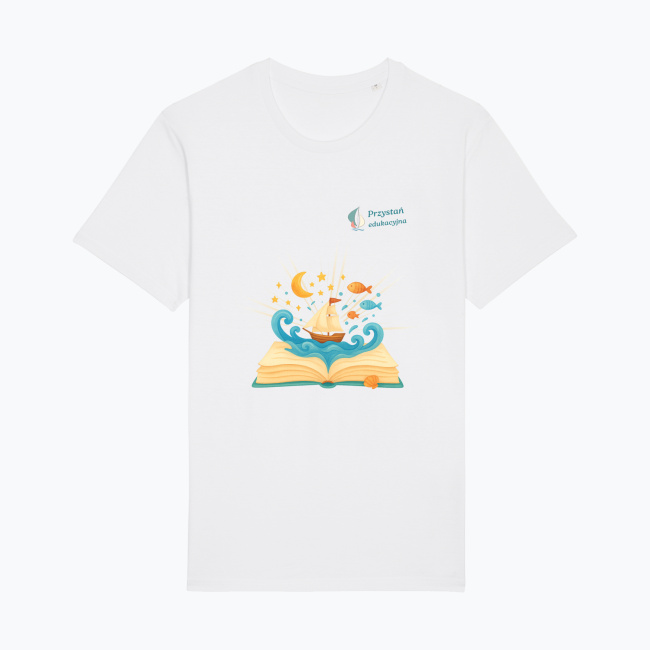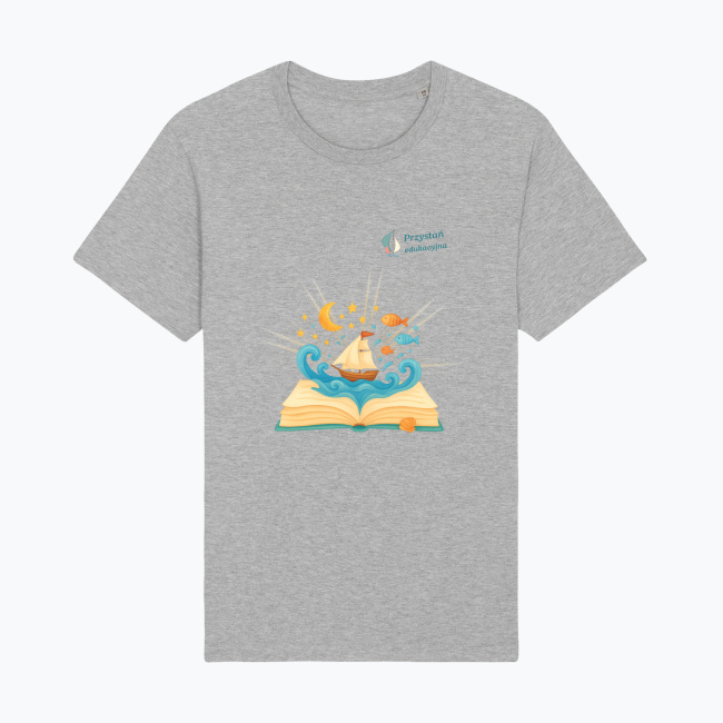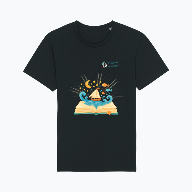 Koszulka „Pod Żaglami Wyobraźni” to ukłon w stronę magii czytania. Ilustracja przedstawiająca otwartą książkę, z której wypływa żaglowiec i morskie fale, przypomina nam, że każda historia może być początkiem wielkiej wyprawy — ku gwiazdom, snom i mądrzejszemu światu. Dla dzieci to brama do bajkowych krain. Dla dorosłych — przypomnienie, że wciąż warto marzyć.