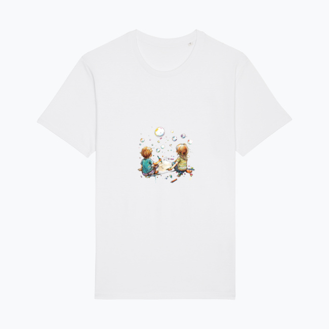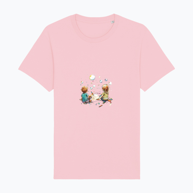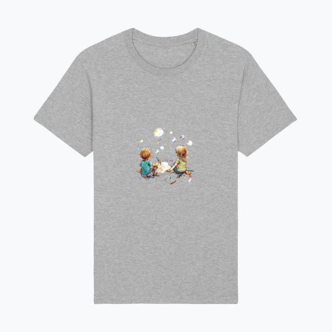 Dwoje dzieci, kartka, kredki i nieograniczona wyobraźnia – ilustracja na tej koszulce to nie tylko obrazek, to przypomnienie. Że warto tworzyć razem. Że najpiękniejsze pomysły powstają, gdy patrzymy w tym samym kierunku, nawet jeśli każdy z nas rysuje inną linię.